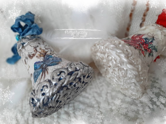 Dzwonki ze steropianu plus grafika,wyciski z foremek silikonowych,farby i lakier akrylowy oraz dodatki biżuteryjne to wszystko ,aby zrobić takie ozdoby na choinkę :)aaaaaaa...zapomniałam o preparacie,który robi spekania na bombkach :)